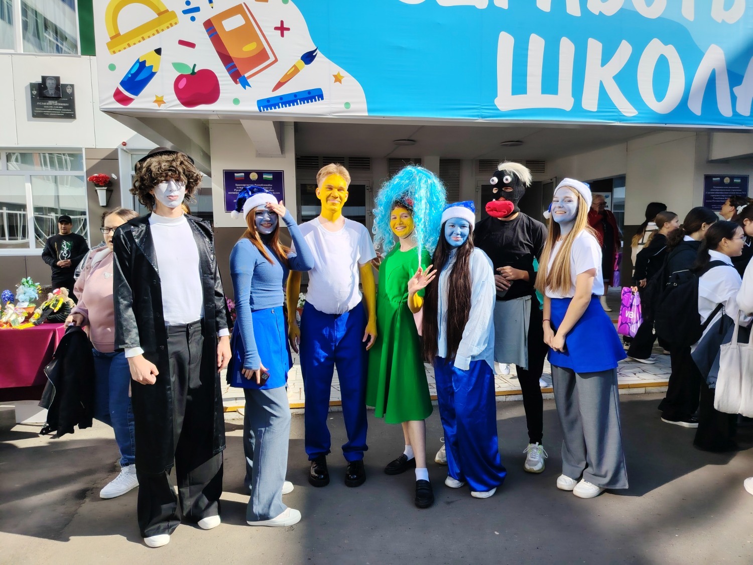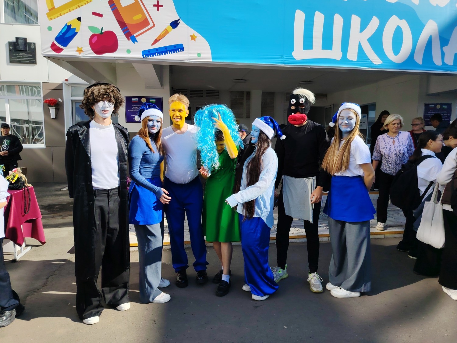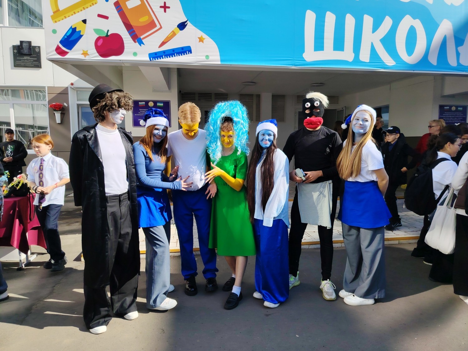 А одиннадцатиклассники первой школы решили развлечь гостей ярмарки и создали праздничную атмосферу, одевшись в костюмы смурфиков.