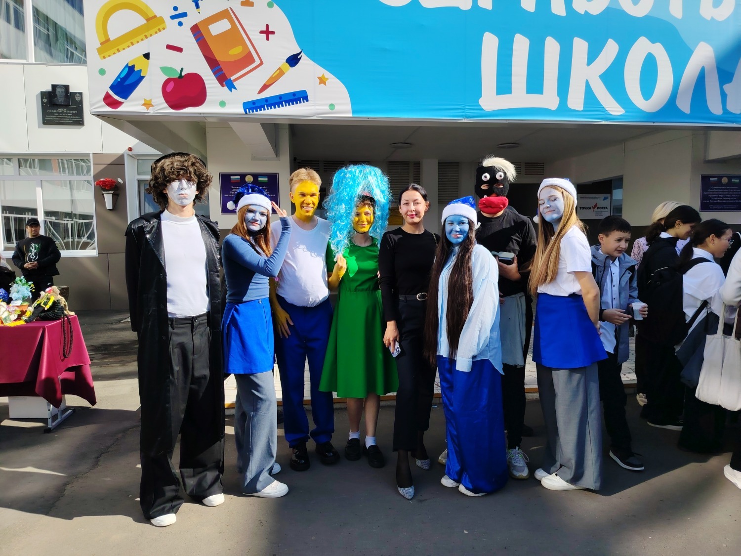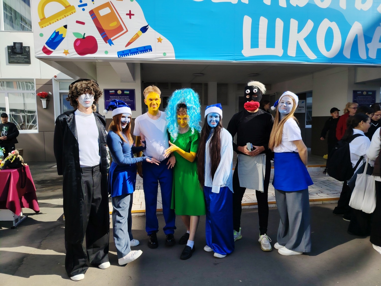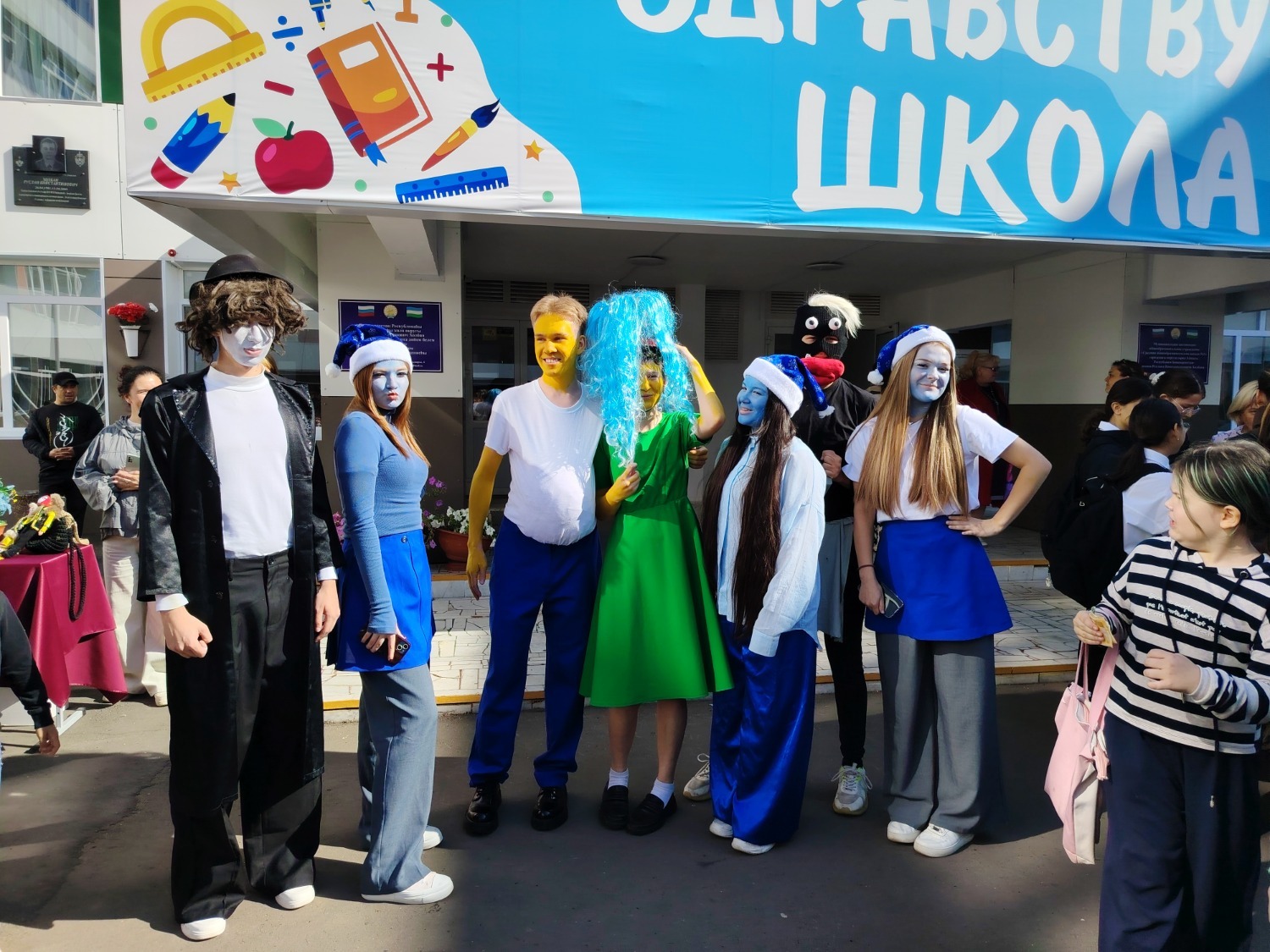 А одиннадцатиклассники первой школы решили развлечь гостей ярмарки и создали праздничную атмосферу, одевшись в костюмы смурфиков.